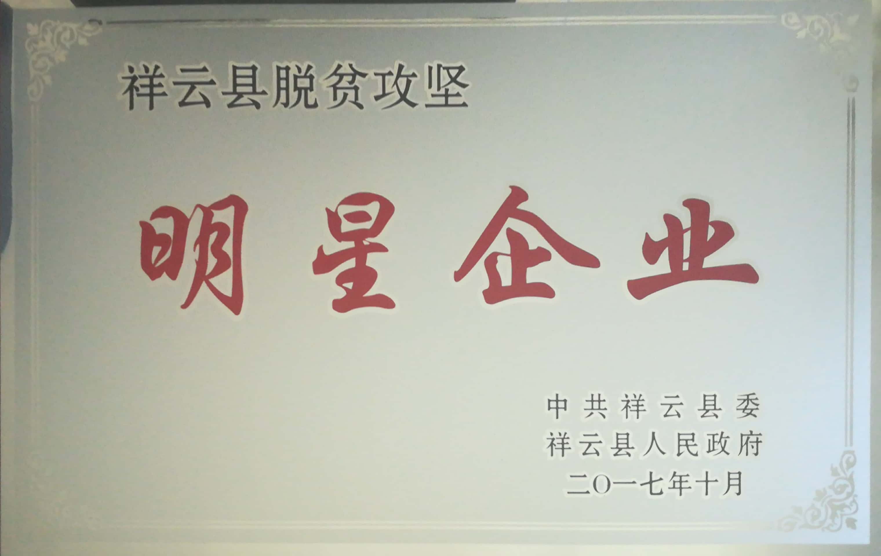 皇正集團(tuán)榮獲祥云縣2017年“脫貧攻堅(jiān)明星企業(yè)”榮譽(yù)稱號(hào)